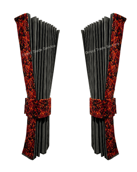 Grå gardinsæt med Rød detaljer i dansk plys. Indeholder 2 gardiner og 2 gardinkapper i dansk plys – perfekt til lastbilkabiner, autocampere osv.