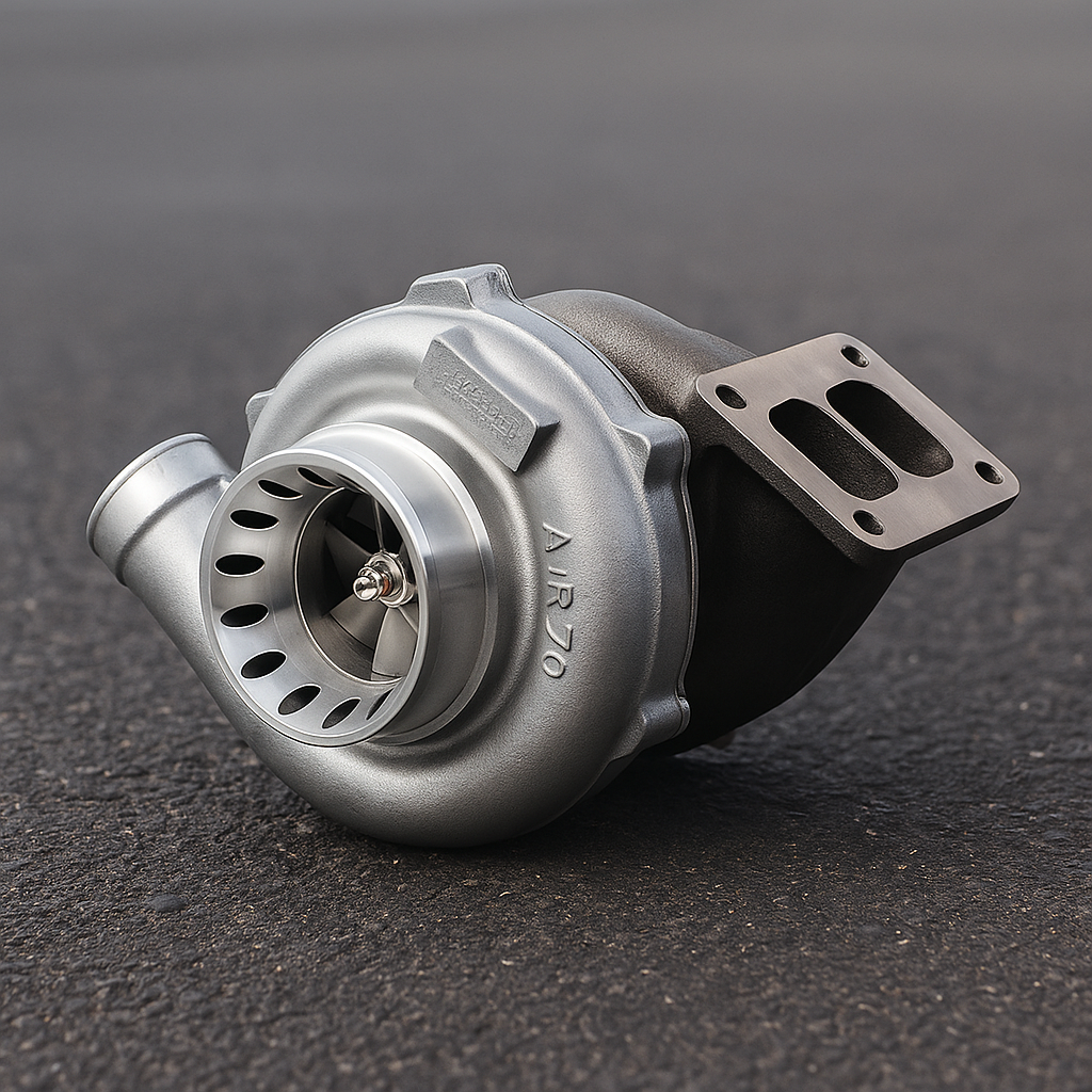 T70 Super Turbo T4 med anti-surge og oliekølet design. 600+ hk potentiale, 4» indgang, 2,5« udgang og 3,25" V-bånd. Til motorer fra 2,5 liter.