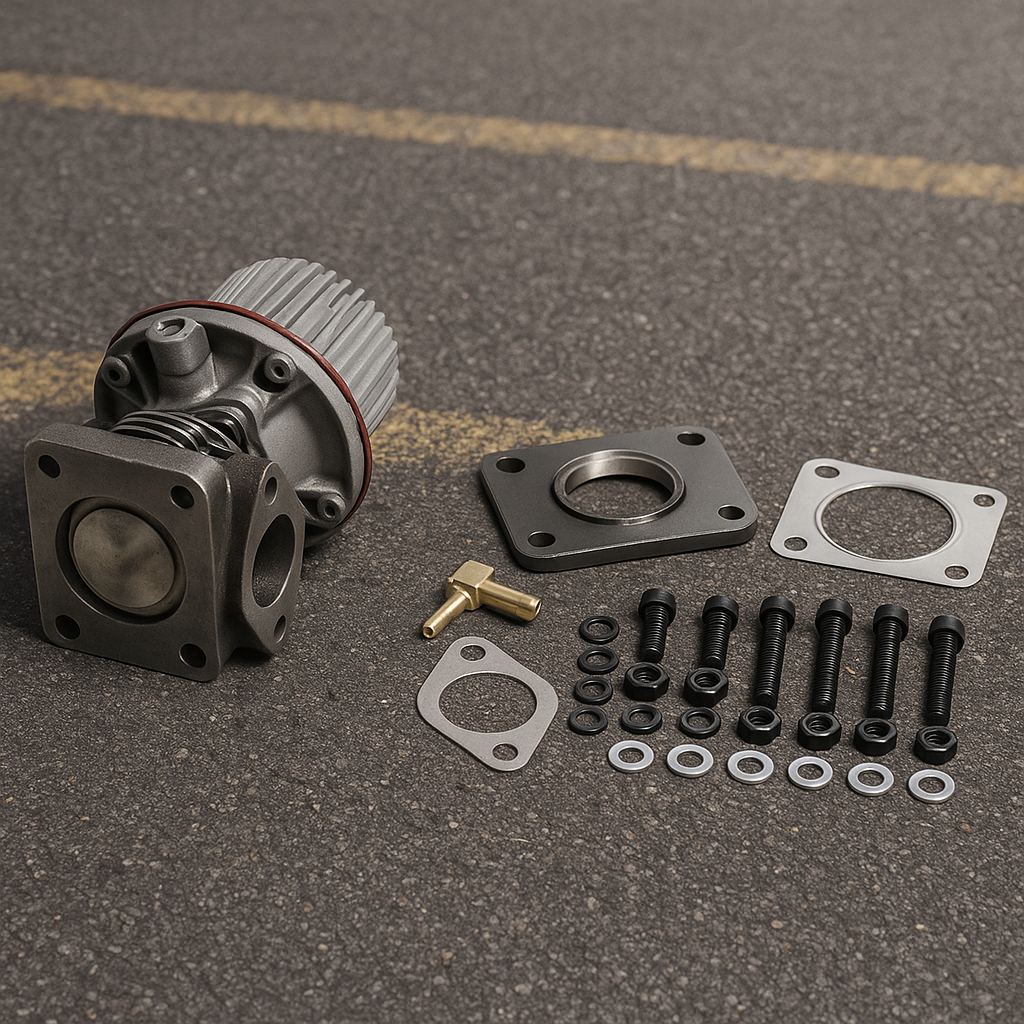 Kraftig 38 mm wastegate med køleribber og 0,55 bar basistryk. Tåler ca. 1000 °C. Komplet sæt med svejseflanger, pakninger, bolte og møtrikker.