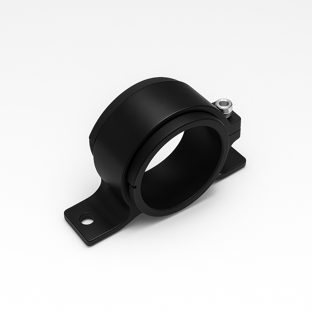 Black anodized pump bracket for external fuel pumps Ø60 mm (Bosch 044). Vibration-damping rubber, two mounting holes, and premium finish. Ideal for neat installations.