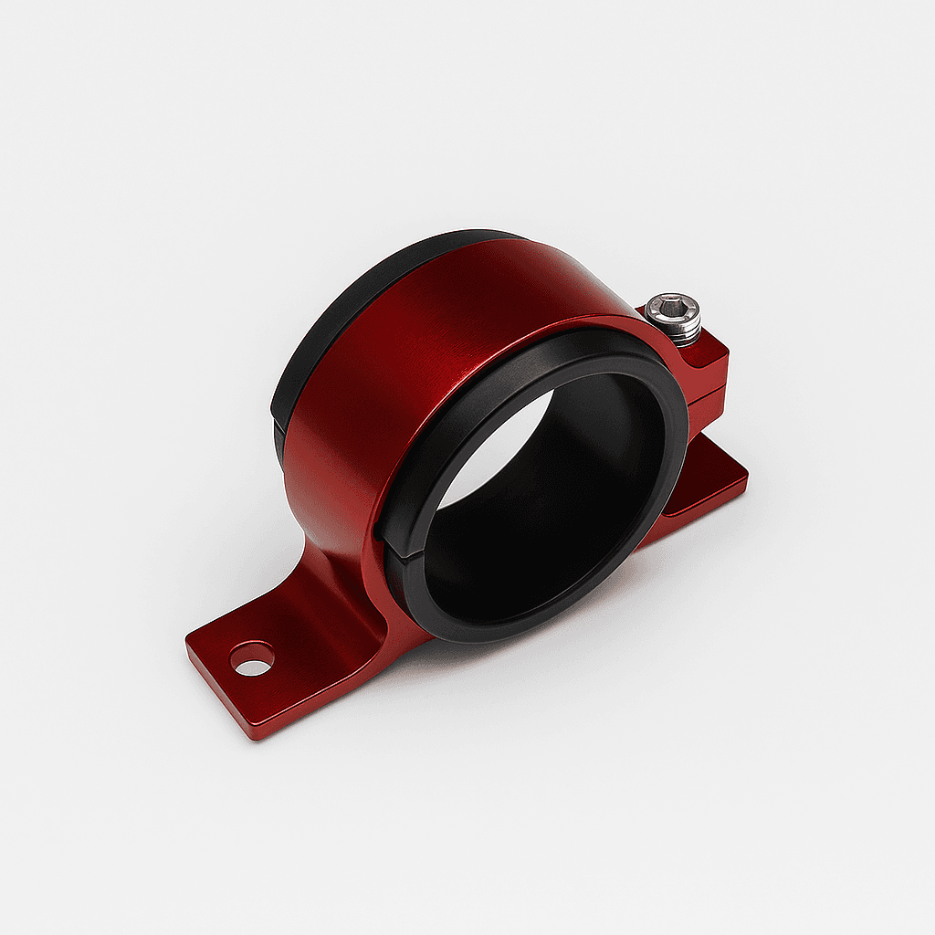 Red anodized pump bracket for external fuel pumps Ø60 mm (Bosch 044). Vibration-damping rubber, two mounting holes, and premium finish. Ideal for neat installations.