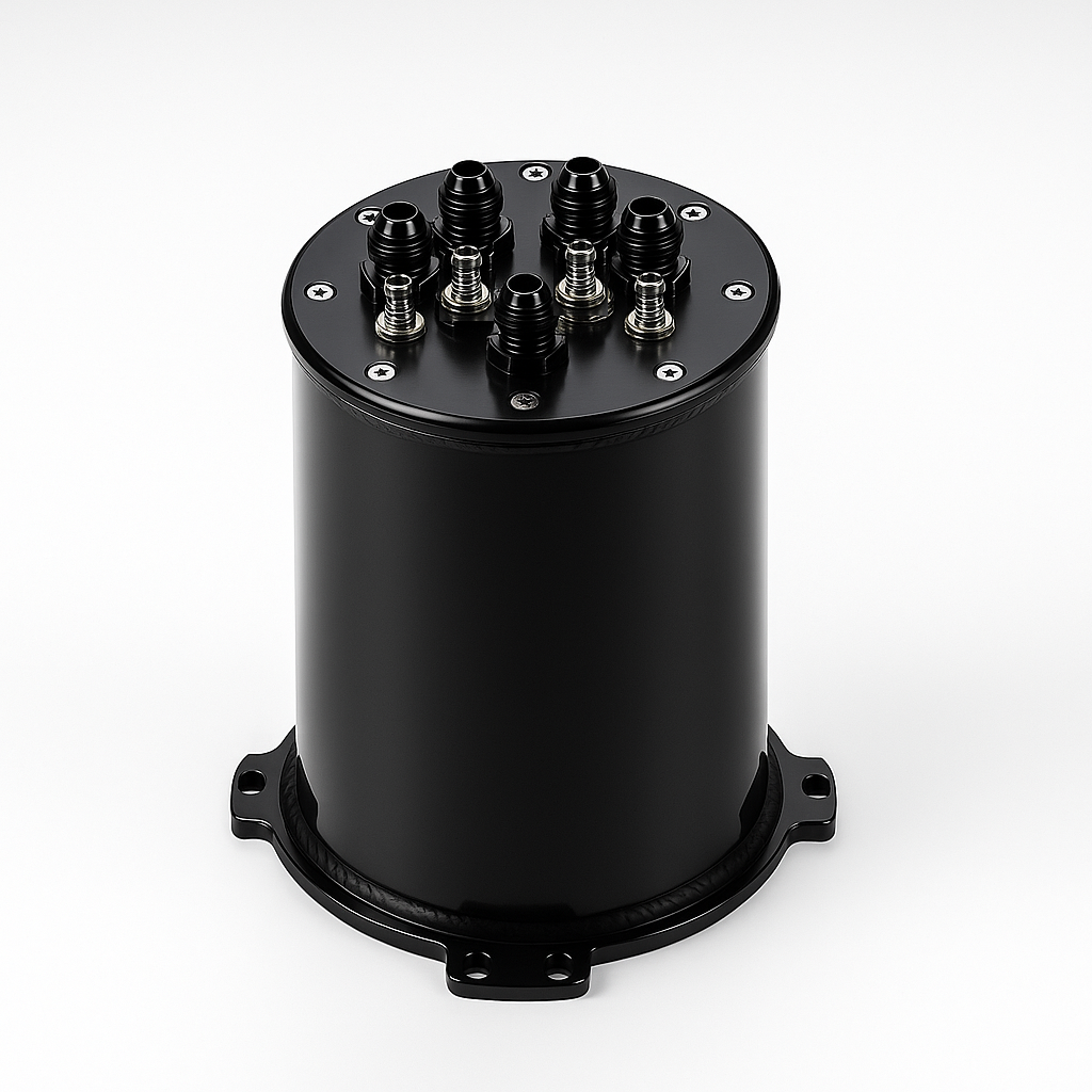 3L catch tank for internal fuel pumps, E85 approved. 5× AN8 connections, low pump placement, for 1–2 pumps (Walbro/AEM/DW).