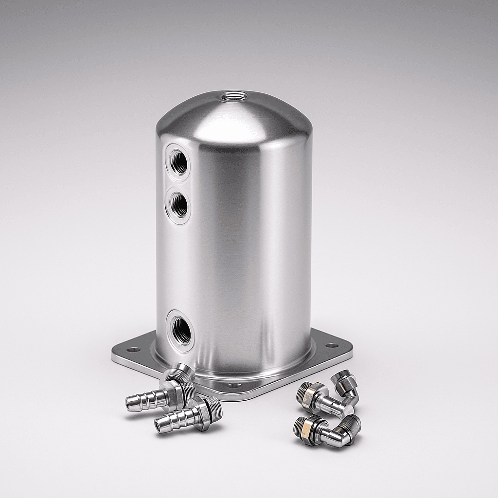 Round fuel catch tank in silver, T6061 aluminum. Hidden welds, robust 2 mm material, volume approx. 1.62 L. 1×AN8 + 3×AN6 and hose nipples included. Stable flow without dry suction.