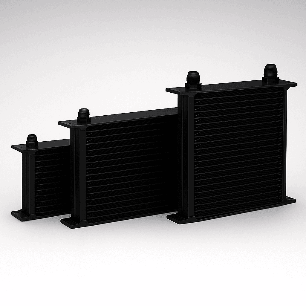 Robust 13-row oil cooler in T-6061 aluminum, black powder coated. AN10/7⁄8-14 JIC, 0.40 L volume. Lowers oil temperature and protects the engine during hard driving.