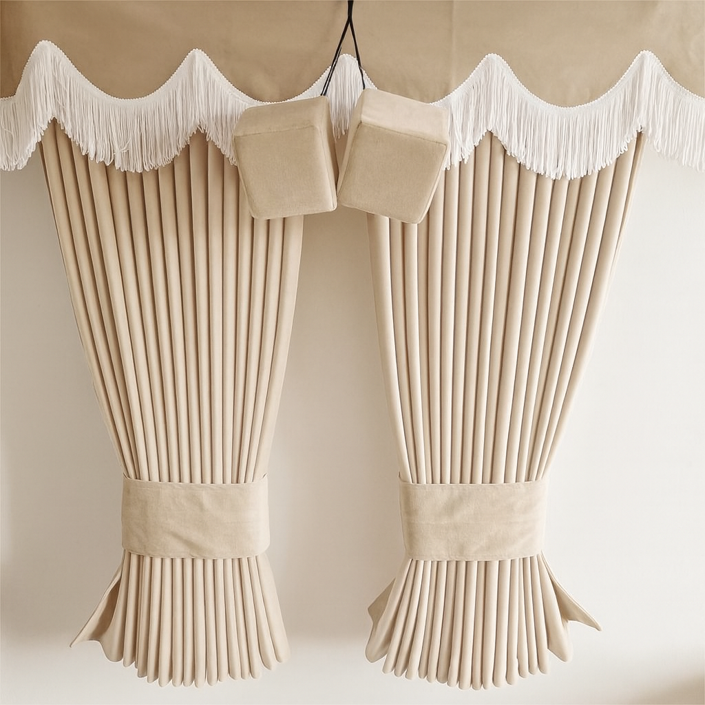 Laadukkaat verhot valmistettu Euroopassa. Kaikki sivuverhot ovat kaksoisommeltuja, ja ne toimitetaan tarranauhalla asennusta varten. Valitset itse verhojen värin ja ulkonäön.