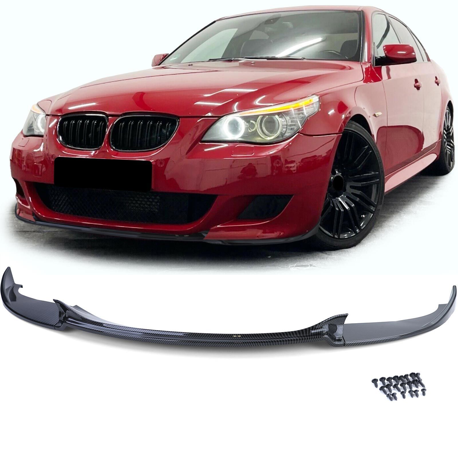 Gi din BMW 5-serie E60/E61 facelift et mer aggressivt og sporty utseende med en frontspoiler i karbonfiberlook. Spoileren er laget av høykvalitets ABS-plast og har en høykvalitets karbonfiberfinish som er ekstra beskyttet med klar lakk/forseglingslag for en mer attraktiv overflate og bedre holdbarhet.