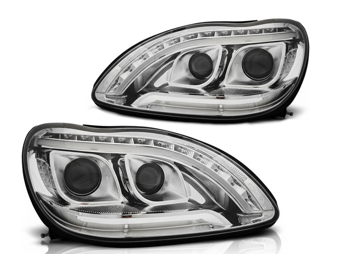 Frontlykter i klart glass med stilig DRL LED-sløyfe for Mercedes S-klasse W220 1998-2005. Pris per par.