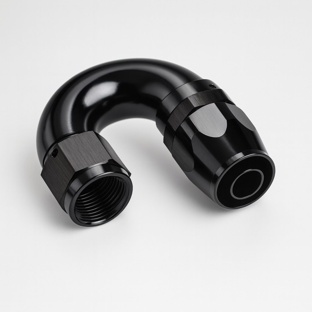 180° AN4-kobling i hardanodisert aluminium. Full gjennomstrømning for maksimal strømning. Kompatibel med E85, bensin og olje. Svart finish – høy kvalitet til riktig pris.