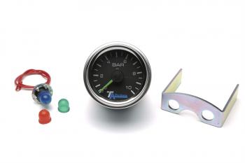 TA Technix dobbel trykkdisplay, svart. Dobbel trykkindikator med to visere, svart skive med BAR-skala. Opplyst skala (gul, rød, grønn eller blå). Metallhus med kromring.