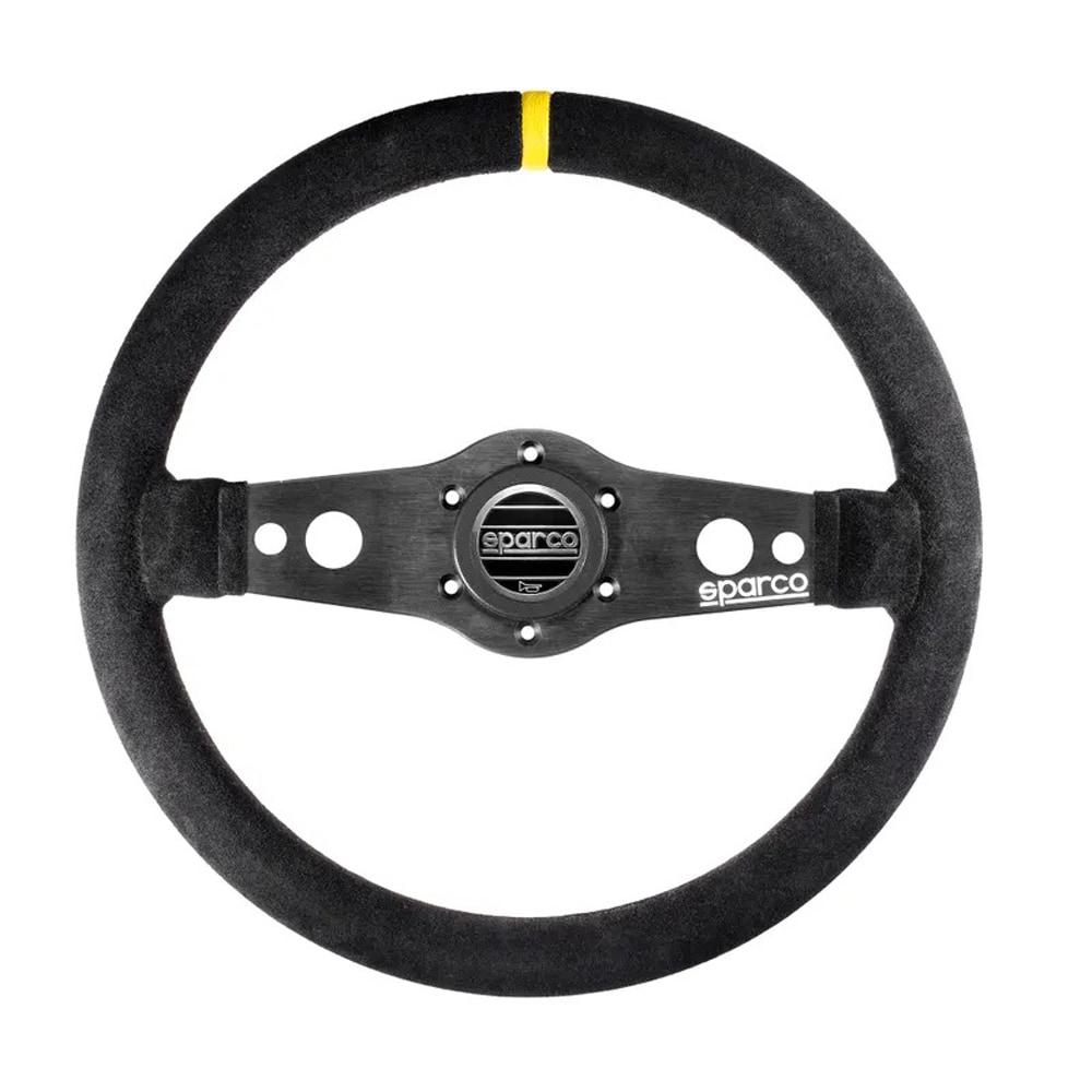 Stilig ratt som er perfekt for racing fra italienske Sparco med 2 eiker. Komfortabel gripeflate i enten skinn eller semsket skinn, og med gul posisjonsindikator helt øverst.