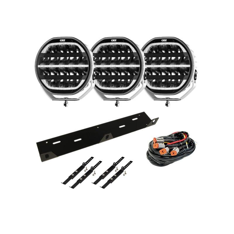 3-Pack med OZZ Extraljus P9 VIT tillsammans med hållare, toppstag och reläsats. Allt du behöver för att montera!